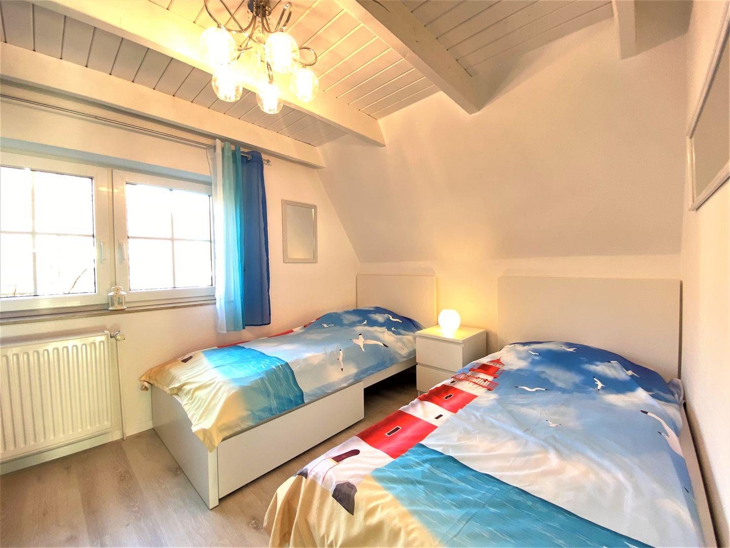 Das Obergeschoss verfügt über zwei getrennte Schlafzimmer: Das Elternschlafzimmer mit Doppelbett, sowie ein weiteres mit zwei Einzelbetten. Das vollwertige Duschbad mit Tageslicht rundet das harmonische Angebot ab.Inkl. Waschmaschine und Trockner.