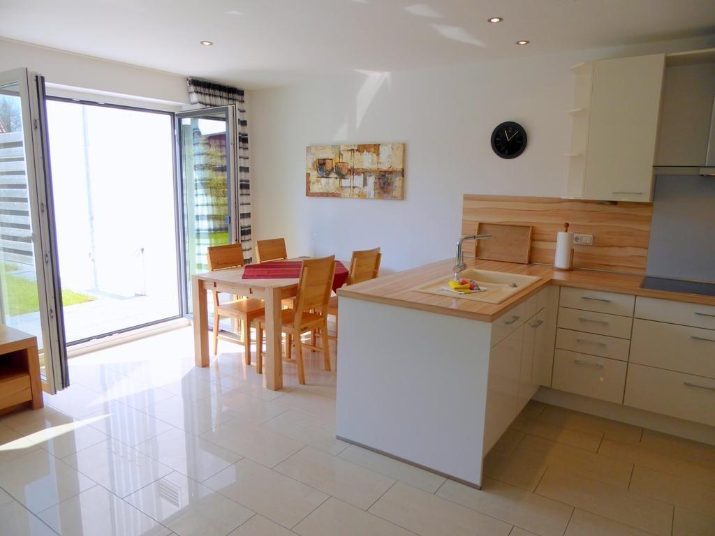 Die offene, sehr schicke Küche lässt schlichtweg keine Wünsche übrig. Am komfortablen Esstisch können Sie in Ruhe und mit Blick in den Garten speisen.