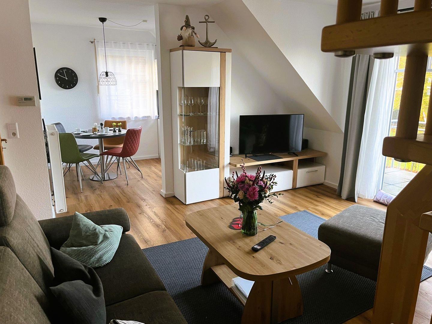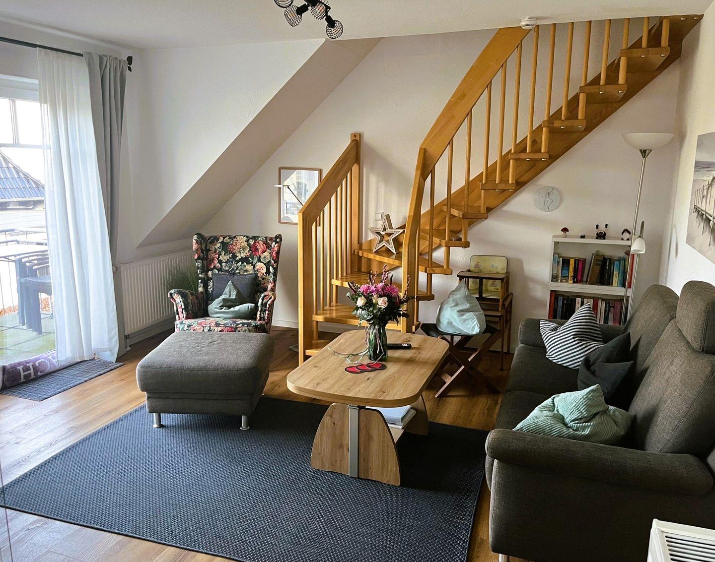 Eine wunderschöne Oberwohnung mit zwei Schlafzimmern, eins mit Ehebett und ein weiteres mit zwei Einzelbetten, einem Duschbad, sowie einem großen sehr ansprechenden Wohnraum mit Sitzecke und angeschlossener Küchenzeile mit Esstisch - hier bleiben kaum Wünsche offen! Auch WLAN-Empfang ist gegen kleines Entgelt verfügbar.