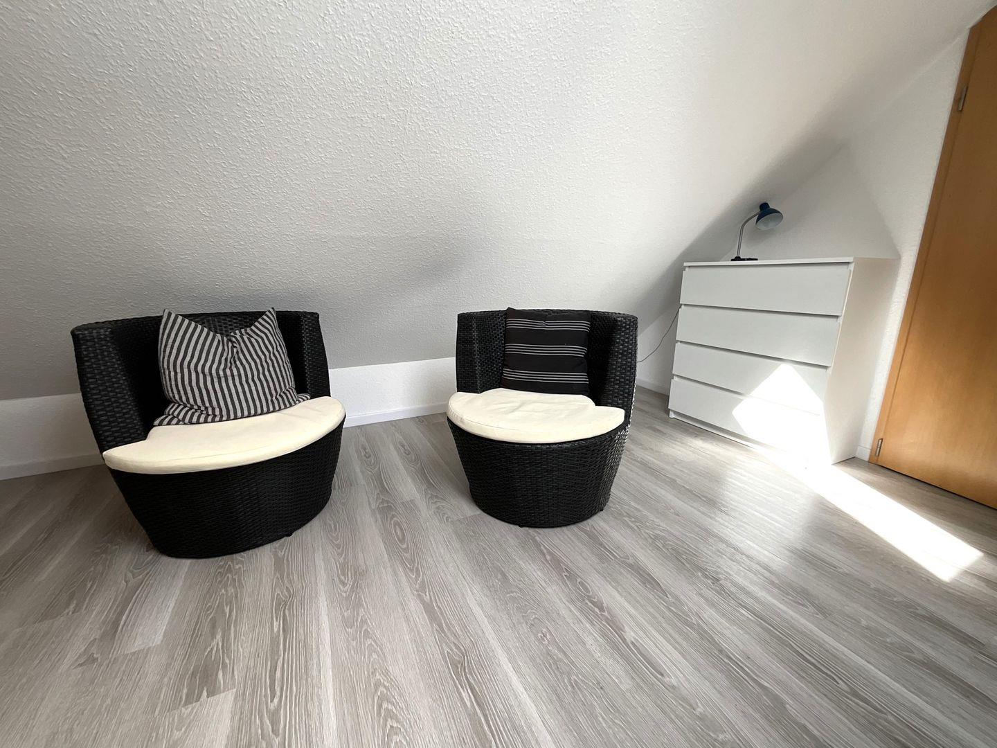 Im gemütlichen Dachstudio befinden sich zwei Einzelbetten und zusätzlich zwei bequeme Sessel zum entspannten Lesen, Platz genug zum Spielen und ein kleiner Fernseher. So nah am Strand und trotzdem können Sie hier einen sehr ruhigen und erholsamen Urlaub verbringen.
