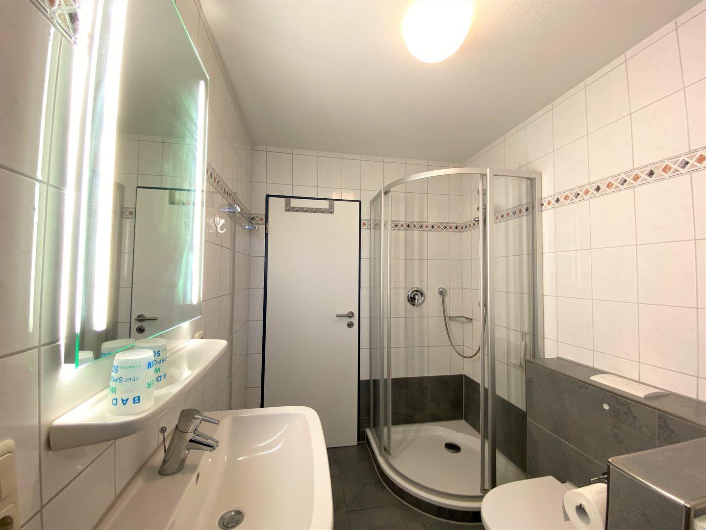 Im hell gehaltenen, schicken Duschbad mit Tageslicht befindet sich auch die Waschmaschine. Verbringen Sie einen angenehmen Urlaub zu zweit oder mit der ganzen Familie.