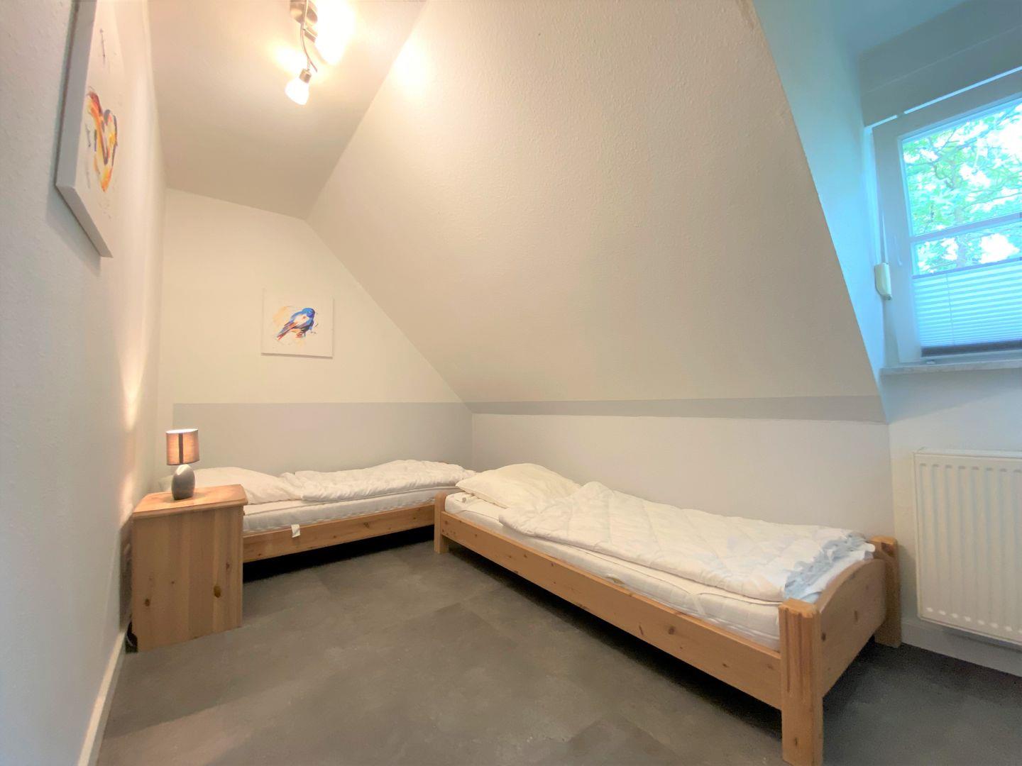Sie verfügen über drei Schlafzimmer: Das Elternschlafzimmer mit Ehebett und ein Kinderschlafzimmer mit zwei Einzelbetten im ersten Geschoss, sowie das dritte Schlafzimmer mit zwei Einzelbetten im ausgebauten Dachstudio.