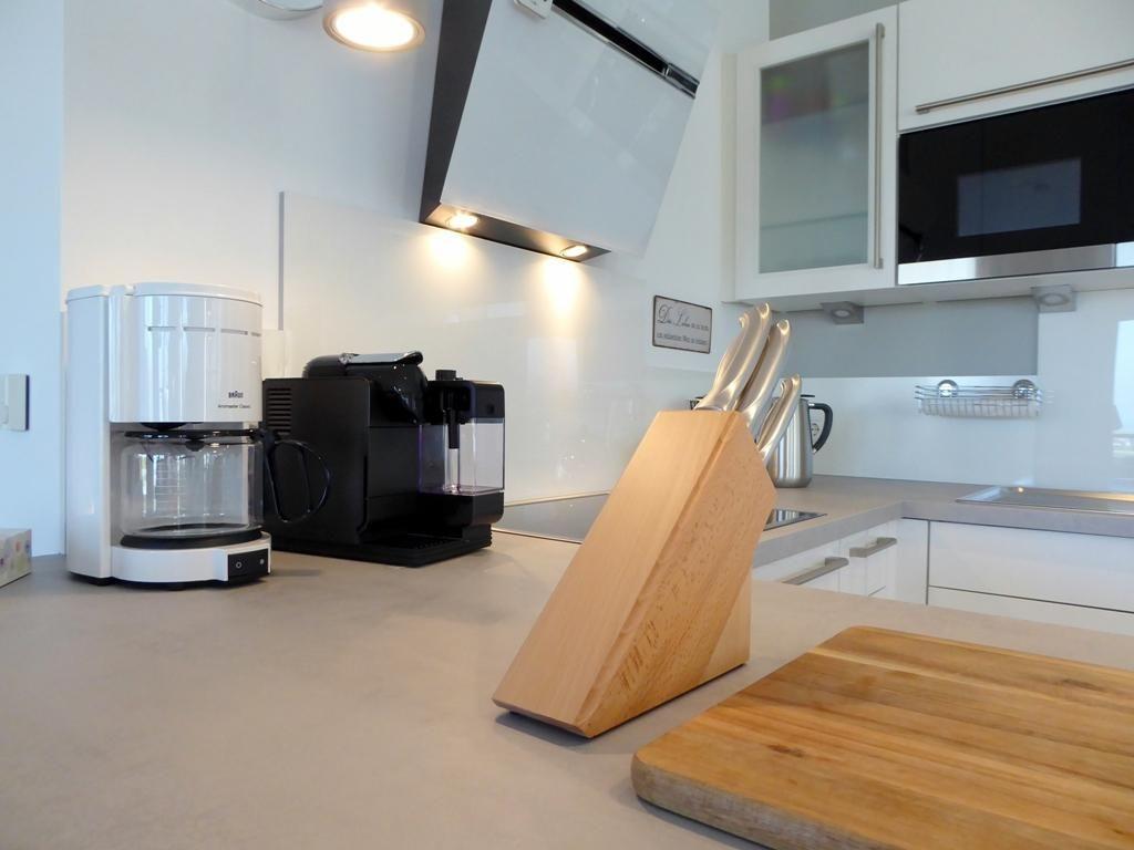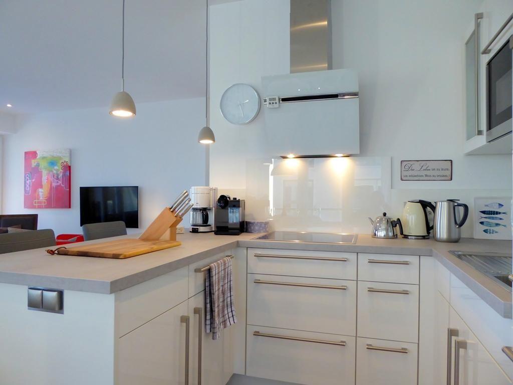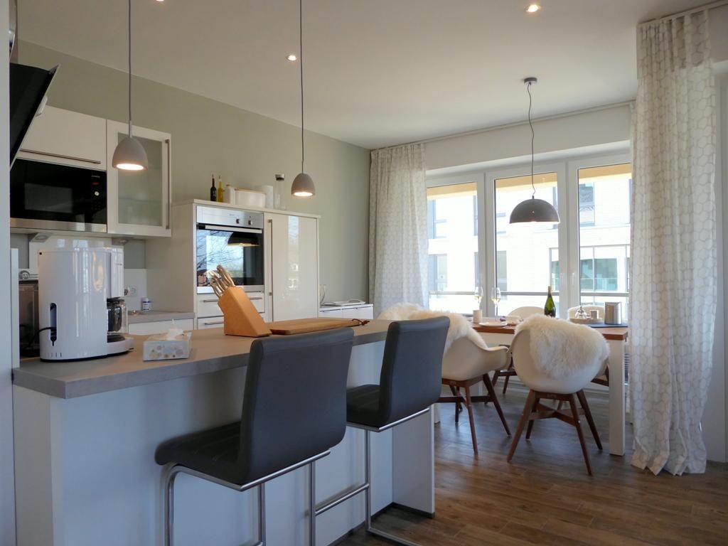 Kochbereich: moderner, offener, voll ausgestatteter Kochbereich mit Arbeitsinsel und Markengeräten, Geschirrspüler, Ceran-Kochfeld, Mikrowelle, Backofen, Dunstabzugshaube, Kaffeefiltermaschine, Senseomaschine, Kühlschrank, Wasserkocher, Toaster