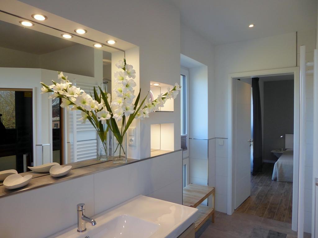 Vom Elternschlafzimmer geht es über zum eigenen Traumbad mit großer, begehbarer Sommerregendusche und einer innovativen Infrarotkabine. Der beleuchtete, große Spiegel über dem Waschtisch mit praktischen Nischen vollendet das harmonische Gesamtbild.