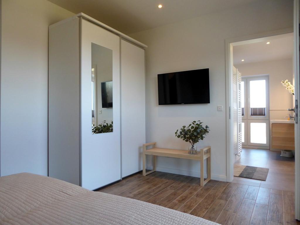 Das Elternschlafzimmer rechts vom Eingang mit großem Doppelbett und Flat-TV bietet viel Tageslicht, ist aber schnell zu verdunkeln dank praktischen Plissees und beschichteter Gardinen. Ein schicker Kleiderschrank mit großem Spiegel rundet das Angebot im Elternschlafzimmer ab.