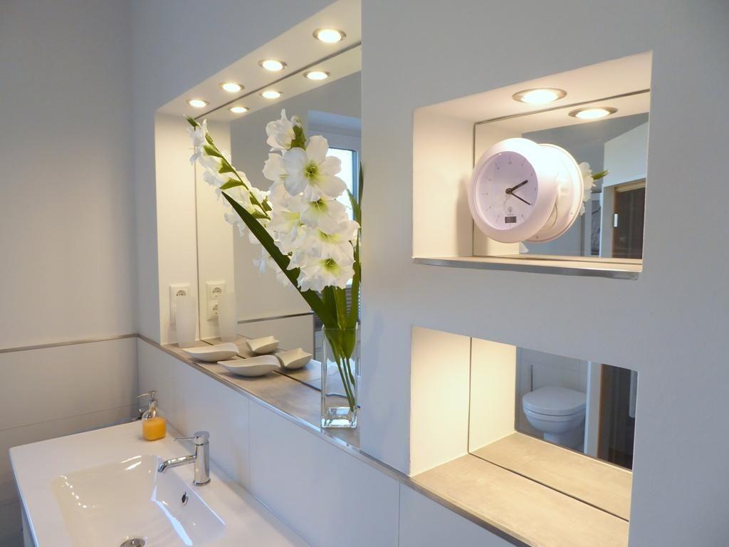 Auch dieses Bad bietet zusätzlichen Komfort dank raffinierter Nischen, Handtuchheizung und großem Spiegel inklusive Kosmetikspiegel.