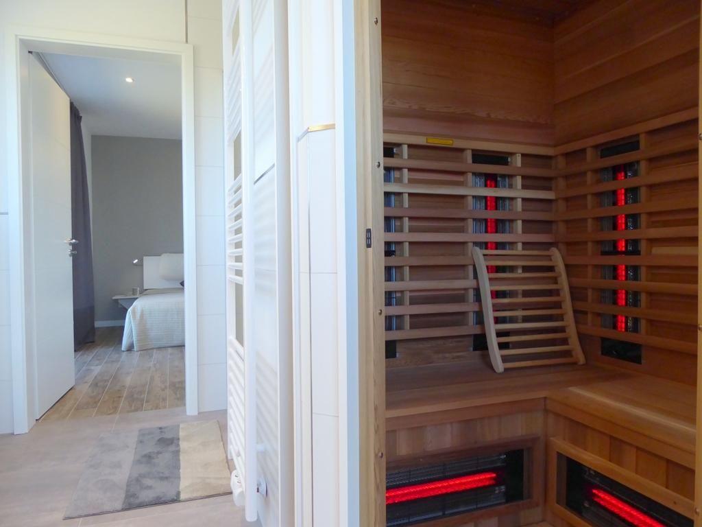 Tageslichtbad: exklusives Tageslichtbad mit moderner Infrarot-Sauna, bodengleiche Walk-In-Sommerregendusche, großer Spiegel, Handtuchwärmer, Fußbodenheizung, Kosmetikspiegel, integrierte Radioanlage und Föhn