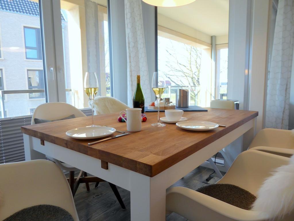 Wohnbereich: hochwertig eingerichteter Wohnbereich mit Sessel, gemütlichem Sofa, Gaskamin, Flatscreen-TV, , WLAN, großem Esstisch mit 4 Stühlen, Fußbodenheizung, direkten Zugang zur Terrasse und herrlichen Blick auf den Jadebusen