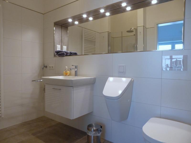 Vom Eingangsbereich rechts gehalten geht es in das schicke Duschbad mit WC und Urinal. Die große, bodengleiche Dusche, eine Handtuchheizung sowie der große beleuchtete Spiegel als Nische über dem Waschbecken bieten allerhöchsten Komfort. Ein Badradio rundet das stimmige Gesamtbild ab.
