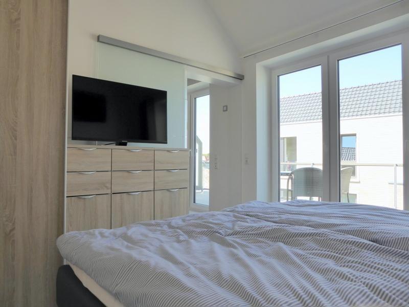 Das Schlafzimmer mit komfortablem Boxspringbett, Nachttischkonsolen, Schiebetürenschrank und großer Kommode bietet viel Tageslicht, ist aber schnell und einfach zu verdunkeln. Die leicht zu bedienenden, extra zur Verdunkelung beschichteten Lamellen lassen sich auch hier einfach vor die bodentiefen Fenster ziehen. Auch hier haben Sie einen direkten Zugang zur Dachterrasse.