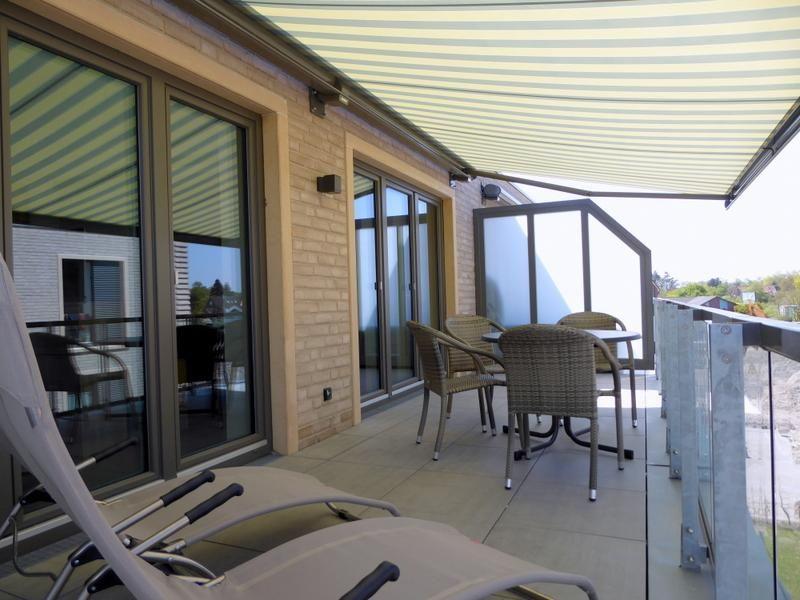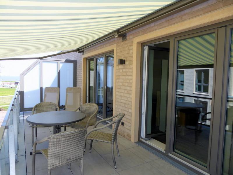 Über die Treppe oder den Aufzug gelangen Sie in Ihr Urlaubsdomizil. Durch den Flur mit moderner Garderobe geht es in den großzügig geschnittenen Wohn- und Essbereich. Der große Esstisch mit Schwingstühlen und die gemütliche Sofaecke laden zum Entspannen ein. Das Ecksofa lässt sich zu einer weiteren Schlafgelegenheit ausziehen. Die leicht zu bedienenden Lamellen lassen sich einfach vor die bodentiefen Fenster ziehen. Durch die Möglichkeit der Schrägstellung kann der Sonneneinfall reguliert werden.