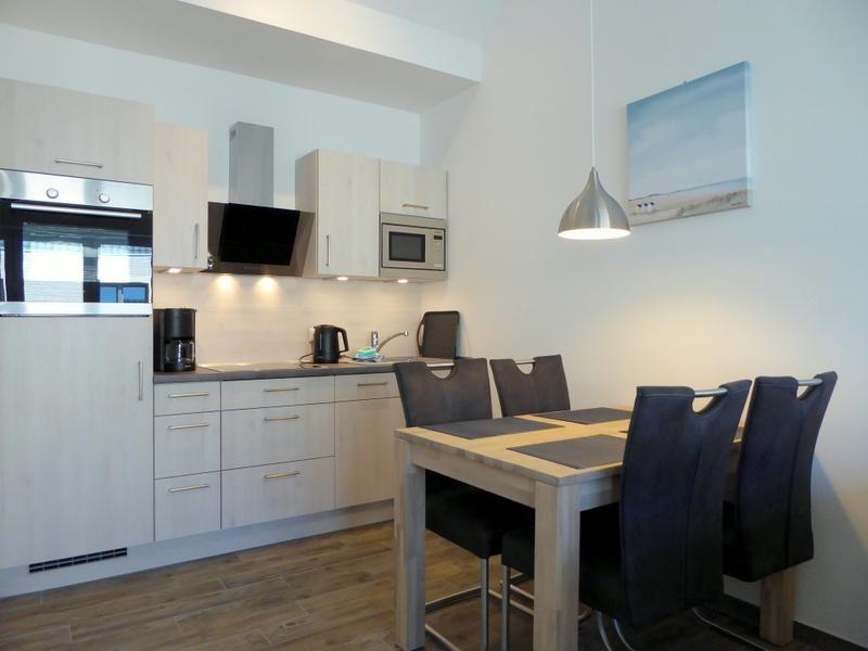 Der Essbereich mit topmoderner Küche ist mit besten Markengeräten ausgestattet. Vom sehr geschmackvoll eingerichteten Wohn-Essbereich gelangen Sie auf die großzügige Dachterrasse mit Markise und seitlichem Meerblick. Die Sonne genießen Sie in zwei bequemen Liegen mit typischem Ostfriesentee oder eiskaltem Getränk am Rundtisch mit Gartenstühlen.