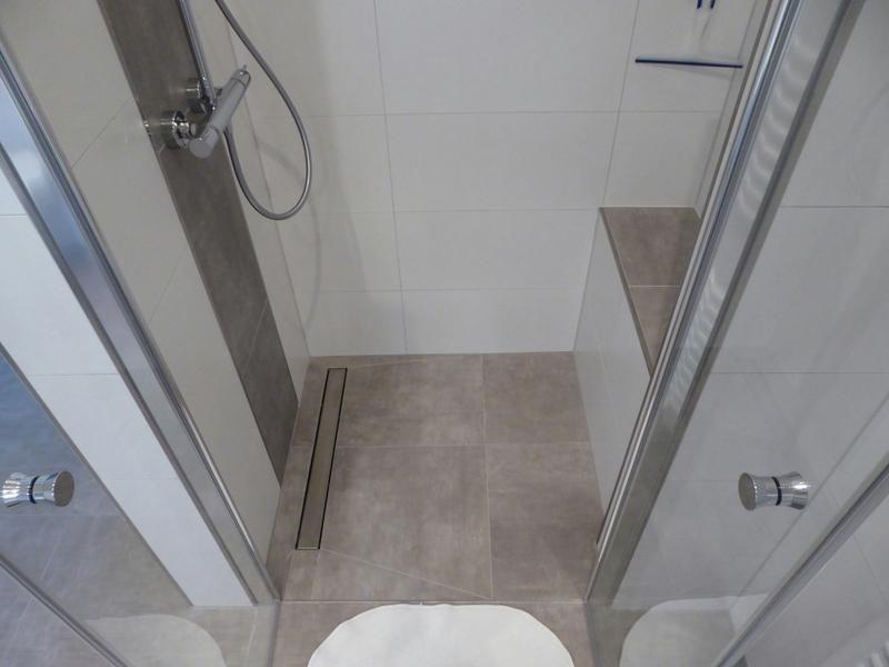 Bad und Sanitär: bodentiefe, barrierefreie Sommerregendusche, Waschtischanlage mit Spiegel, WC, Handtuchheizung, Handtücher auf Anfrage