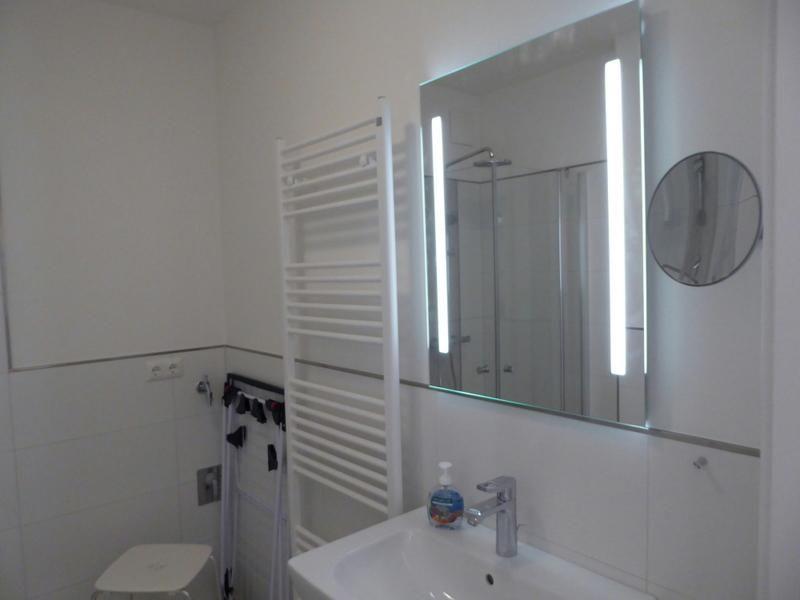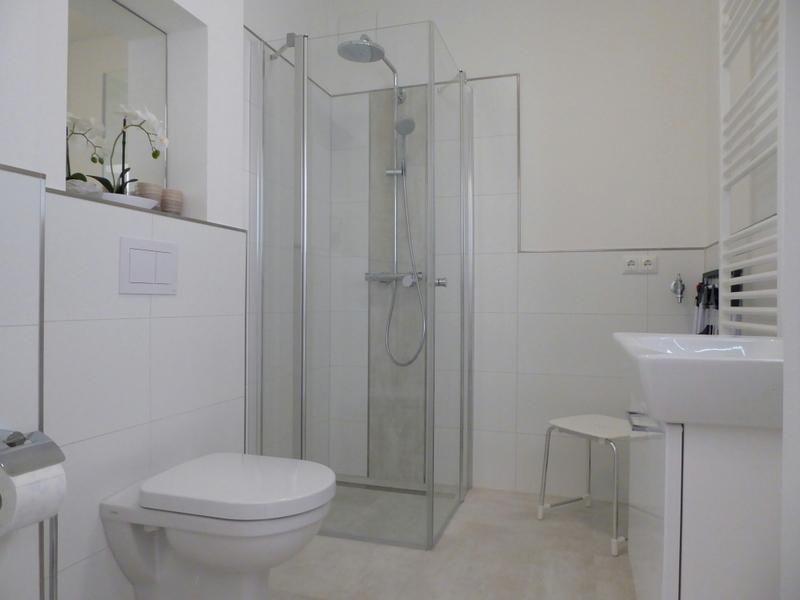 Bad und Sanitär: bodentiefe, barrierefreie Regendusche mit Handbrause, Waschtisch mit Spiegel, Föhn, Kosmetikspiegel, WC, Handtuchheizung, Handtücher auf Anfrage
