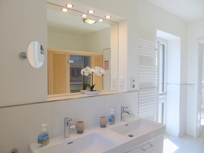 Vom Elternschlafzimmer geht es zum lichtdurchfluteten Bad mit großer, begehbarer Sommerregendusche, WC und einer innovativen Wärmekabine. Der beleuchtete, große Spiegel über dem Doppel-Waschtisch vollendet das harmonische Gesamtbild.