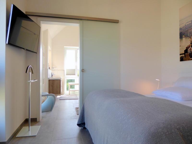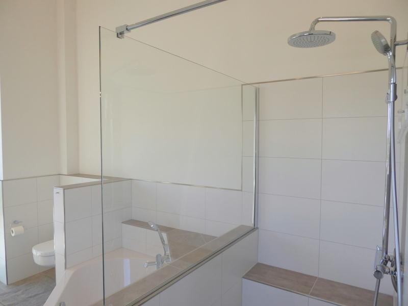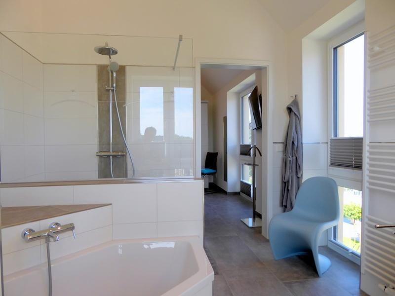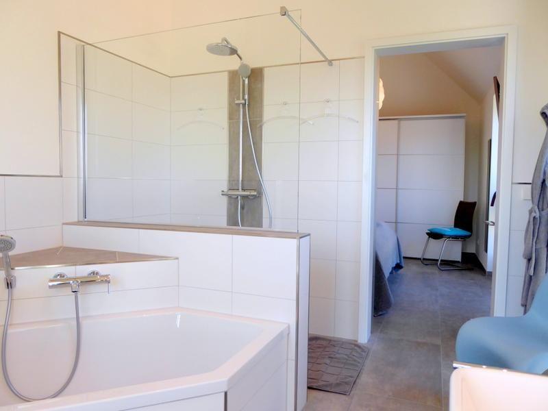 Vom Schlafzimmer gelangen Sie durch eine elegante Glasschiebetür in Ihr persönliches Traumbad mit großer, offener und begehbarer Sommerregendusche und einer Eckbadewanne. Der Waschtisch mit beleuchtetem Spiegel sowie ein WC vervollständigen das Angebot.