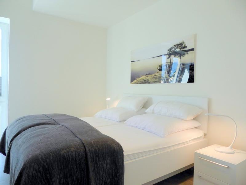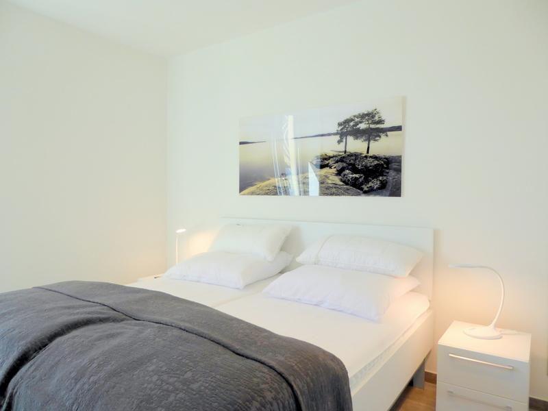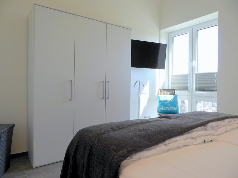 Über einen Fahrstuhl oder die Treppe gelangen Sie in Ihr Premiumdomizil. Gleich links geht es schon in das erste Schlafzimmer mit großem Doppelbett plus großem Kleiderschrank. Ein Flat-TV an der Wand rundet das Angebot ab. Die Fenster sind mithilfe abdunkelnder Plissees schnell und einfach zu verdunkeln.