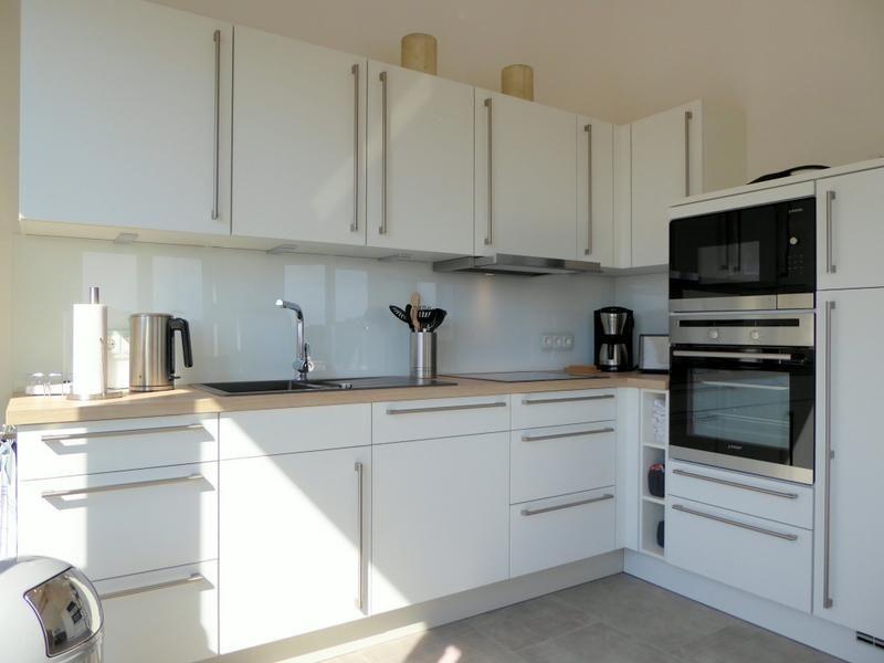 Kochbereich: moderner, offener, voll ausgestatteter Kochbereich, Kaffeefiltermaschine, Geschirrspüler, Ceran-Kochfeld, Mikrowelle, Backofen, Dunstabzugshaube, Kühlschrank mit Gefrierfach, Wasserkocher, Toaster