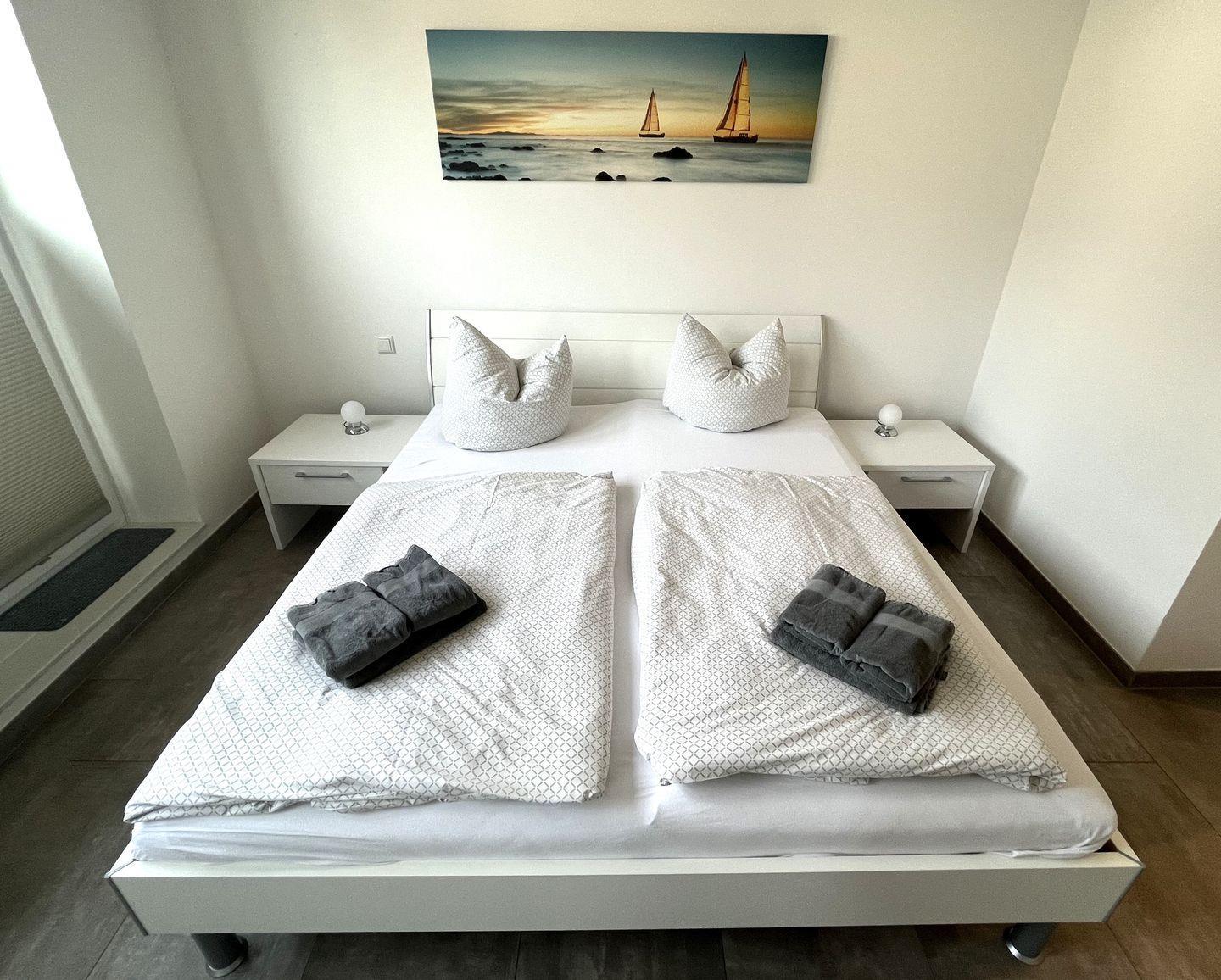 Schlafzimmer: Doppelbett (2 Matratzen à 90 x 200 cm), Leselampen, Kleiderschrank, Stuhl