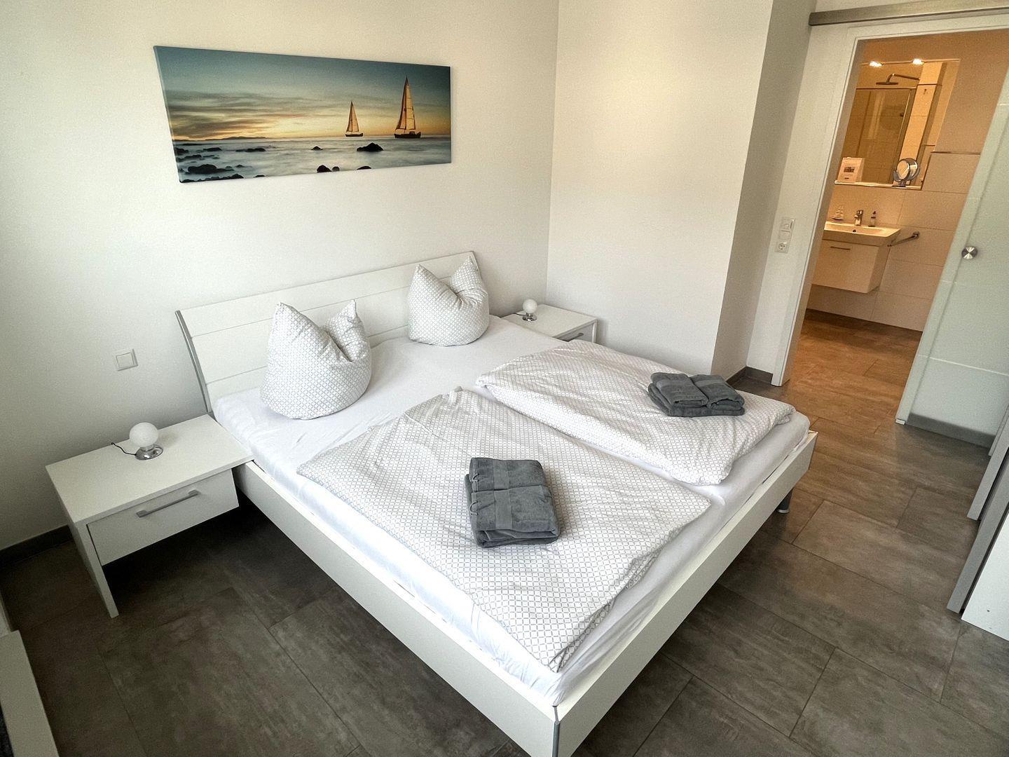 Entweder vom Duschbad oder vom Wohn-Essbereich gelangen Sie durch eine Glasschiebetür in Ihr Schlafzimmer.
