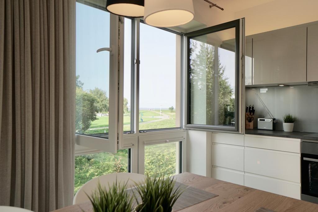 Am Abstellraum mit diversen Haushaltsutensilien vorbei geht es in den großen, wunderschönen Wohn-Essbereich mit Zugang zur Loggia. Beim Speisen und Beisammensein können Sie den Blick auf den Deich mit dem Jadebusen genießen. Auf der bequemen Couch oder im Relaxsessel können Sie gemütlich verweilen. Ein großer Flat-TV und ein Retroradio in der Küche sorgen für ausreichend Unterhaltung. Die große, vollwertige Küche macht einen sehr hochwertigen Eindruck und lässt keinerlei Kochwünsche offen.