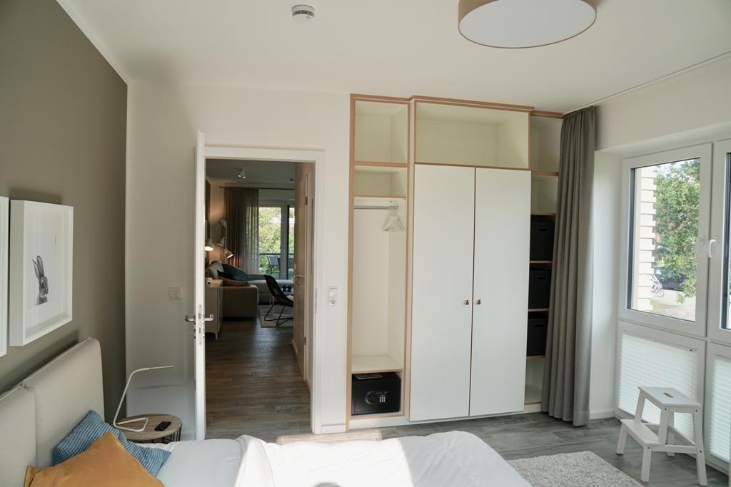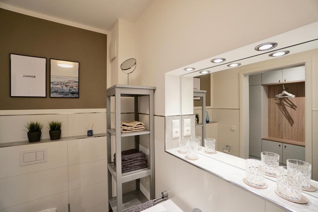 Über einen Fahrstuhl oder die Treppe gelangen Sie in Ihr Feriendomizil. Gleich links gehalten finden Sie das geräumige Duschbad mit begehbarer Sommerregendusche, Waschtisch und WC. Direkt gegenüber geht es in das erste Schlafzimmer mit Doppelbett plus großer Schrankwand inkl. Flat-TV. Die Fenster sind dank beschichteter Vorhänge schnell und einfach zu verdunkeln.