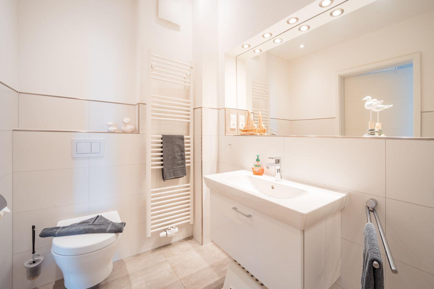 Das Bad liegt nur wenige Schritte neben der Sauna. Hier lädt die Walk-In-Sommerregendusche mit zusätzlicher Handbrause zum Abkühlen zwischen den Saunagängen ein. Zwei Handtuchheizkörper, ein integriertes Radio, ein großer Spiegel und viel Ablagefläche runden die komfortable Badausstattung ab.