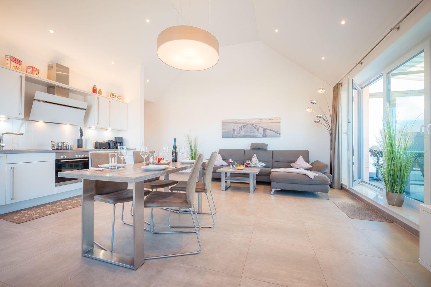Der großzügige, lichtdurchflutete Wohnraum mit moderner Küchenzeile besticht auch bei ungemütlichem Wetter durch seinen Gaskamin mit wohliger Wärme auf Knopfdruck. Am zentralen Esstisch genießen Sie im Feuerschein vor dem Kamin Ihr Urlaubsmenü - oder spielen eines der Gesellschaftsspiele, die wir für Sie bereithalten. Oder Sie relaxen auf der Wohnlandschaft mit Ottomane vor dem eindrucksvollen 65 Zoll-4K-Flachbild-TV. Schnelles WLAN ist natürlich auch inklusive.