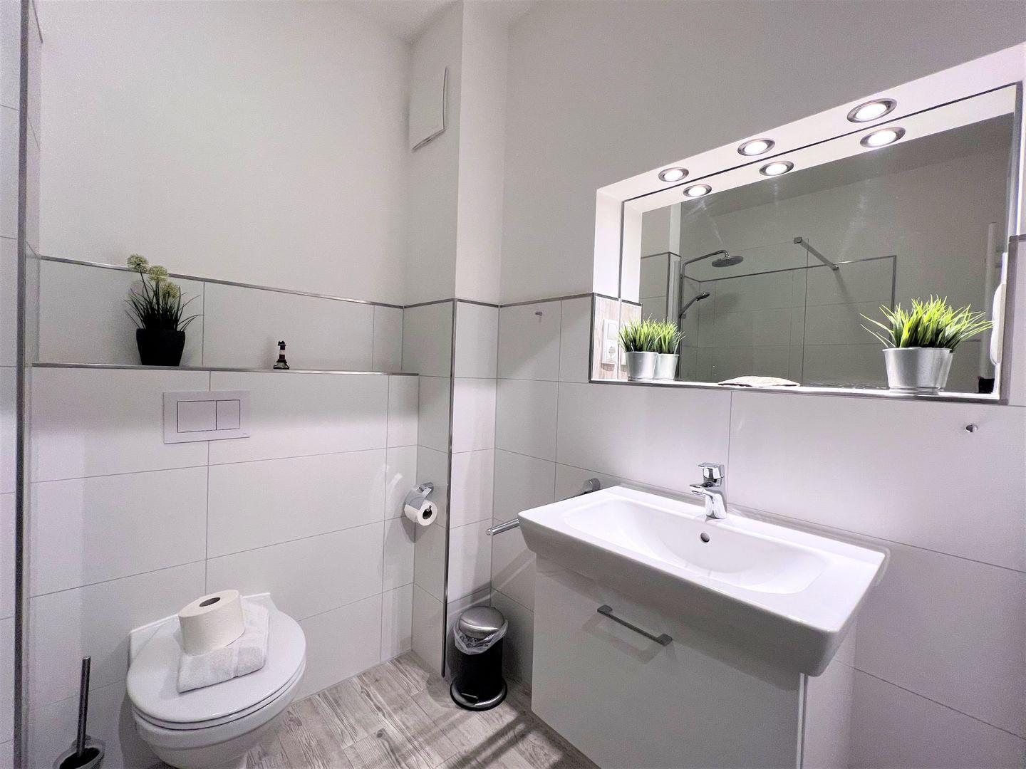 Vom Eingangsbereich gleich rechts gehalten geht es in das schicke Duschbad mit WC. Die große, bodengleiche Dusche, eine Handtuchheizung sowie der beleuchtete Spiegel als Nische über dem Waschbecken bieten allerhöchsten Komfort. Die begehbare Dusche ist auch für Gäste mit Behinderungen bestens geeignet.