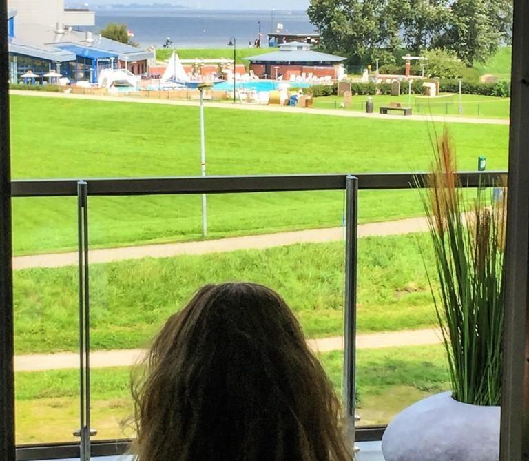Das Elternschlafzimmer rechts vom Eingang mit großem Doppel-Boxspringbett bietet viel Tageslicht, ist aber dank beschichteter Vorhänge schnell zu verdunkeln. Sogar vom Bett aus hat man einen traumhaften Blick auf den Jadebusen mit dem Leuchtturm Arngast. Ein schicker Kleiderschrank mit ausreichend Stauraum rundet das Angebot im Elternschlafzimmer ab.