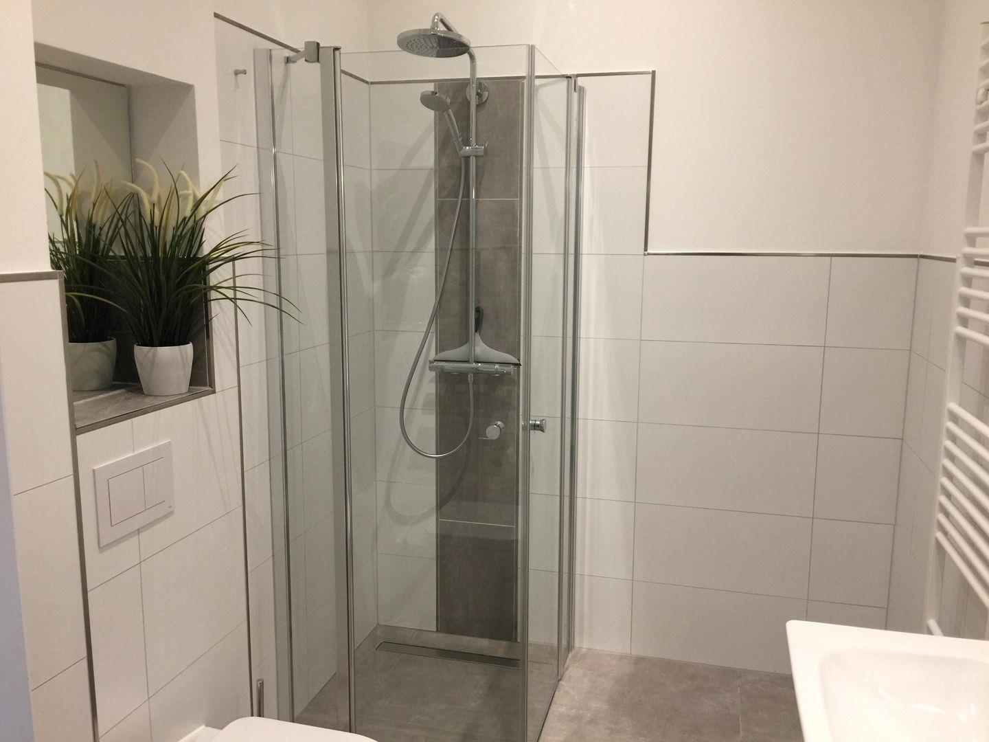 Duschbad: 1 elegantes Duschbad mit bodengleicher Sommerregendusche, Fußbodenheizung, Handtuchwärmer und WC