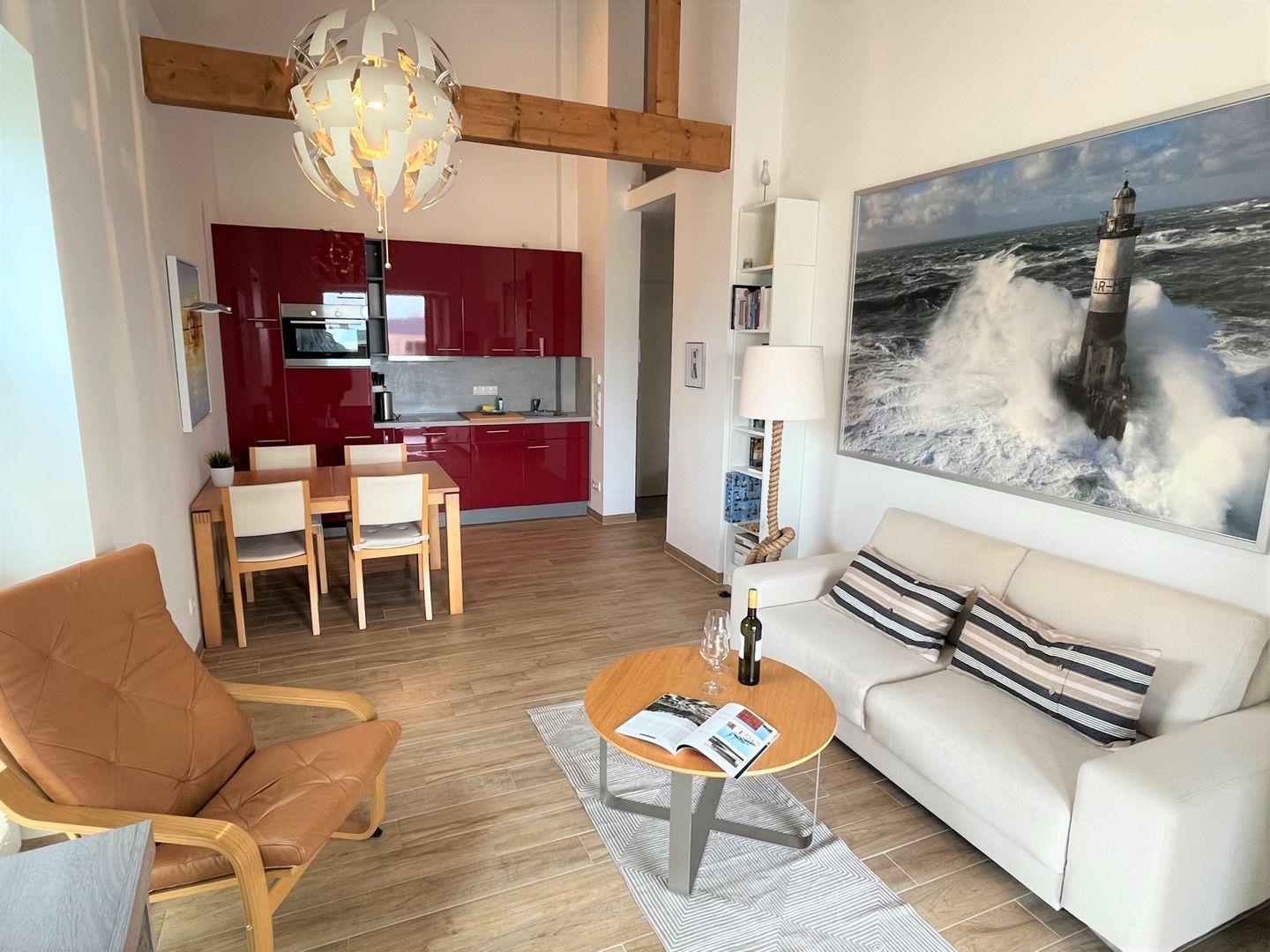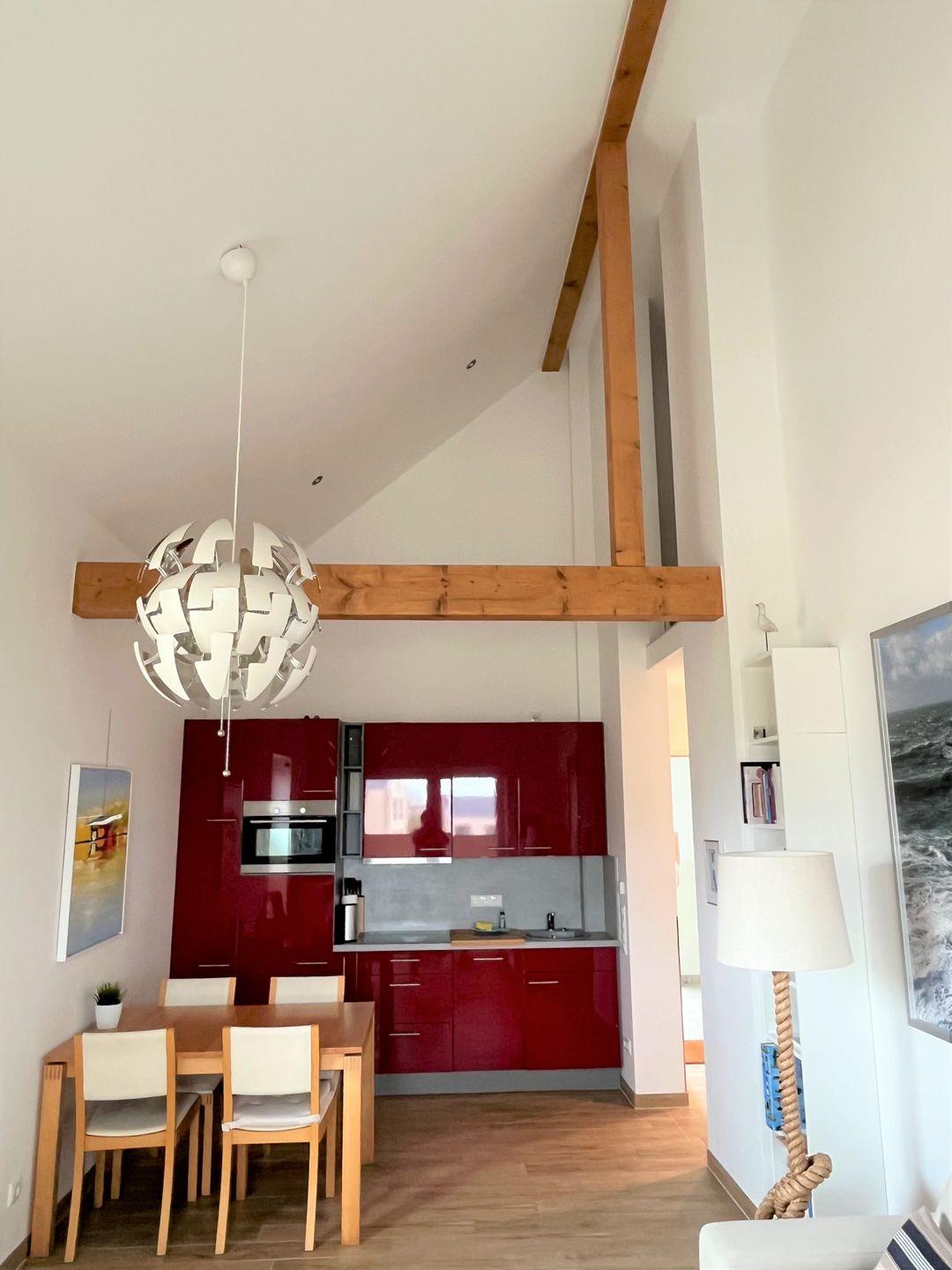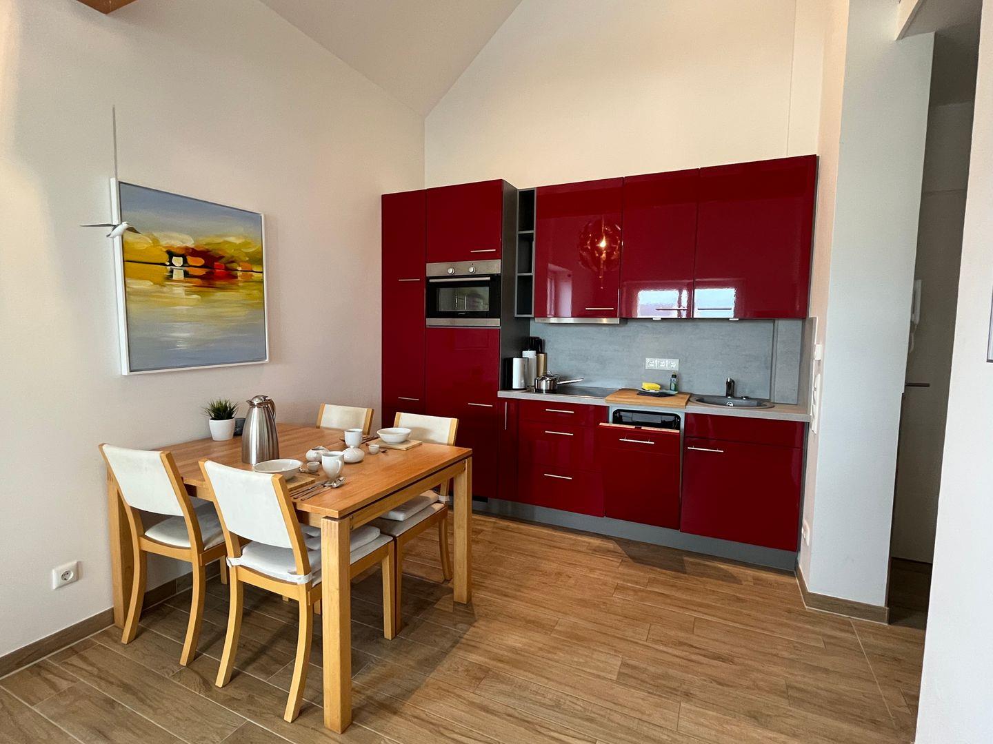 Über einen Aufzug oder die Treppe gelangen Sie zum Apartment im 2. Obergeschoss. Vom Eingangsbereich mit praktischer Garderobe geht es in Ihr Wohlfühldomizil - das Sonnendeck! Der Essbereich mit Esstisch und vollausgestatteter Küche in leidenschaftlichem Rot ist mit besten Markengeräten ausgestattet. Warme Holztöne und zahlreiche Details im Apartment geben einem das Gefühl, an Deck zu sein.