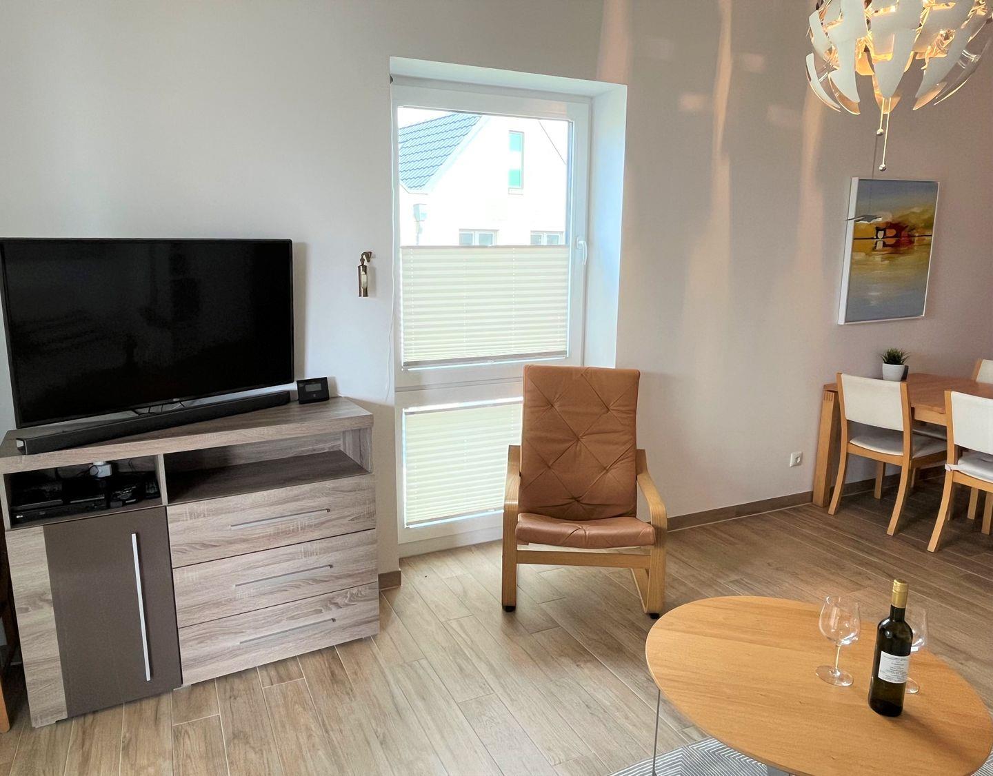 Vom großzügig geschnittenen Wohnbereich mit Flat-TV, Blueray-Player, Digitalradio, DVDs und Büchern gelangen Sie auf den großen, überdachten Westbalkon mit modernen Gartenmöbeln. Der seitliche Blick geht auf das Dangast Quellbad und auf das Wattenmeer, auch eine Sonnenliege steht Ihnen zur Entspannung zur Verfügung.