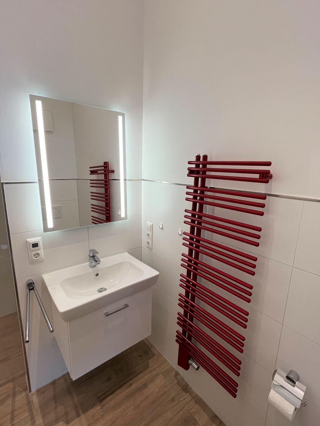 Vom Eingangsbereich direkt links geht es über eine Schiebetür mit Bullauge in das komfortable Duschbad mit roten Akzenten. Die bodengleiche Sommerregendusche ist auch für eingeschränkte Personen gut geeignet. Ein Waschtrockner steht Ihnen zur Nutzung frei zur Verfügung.