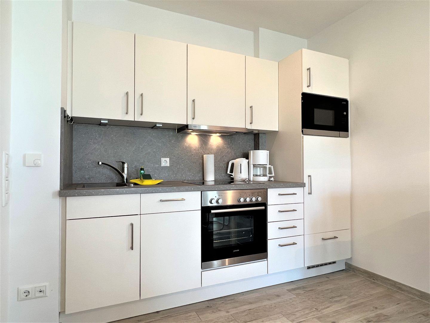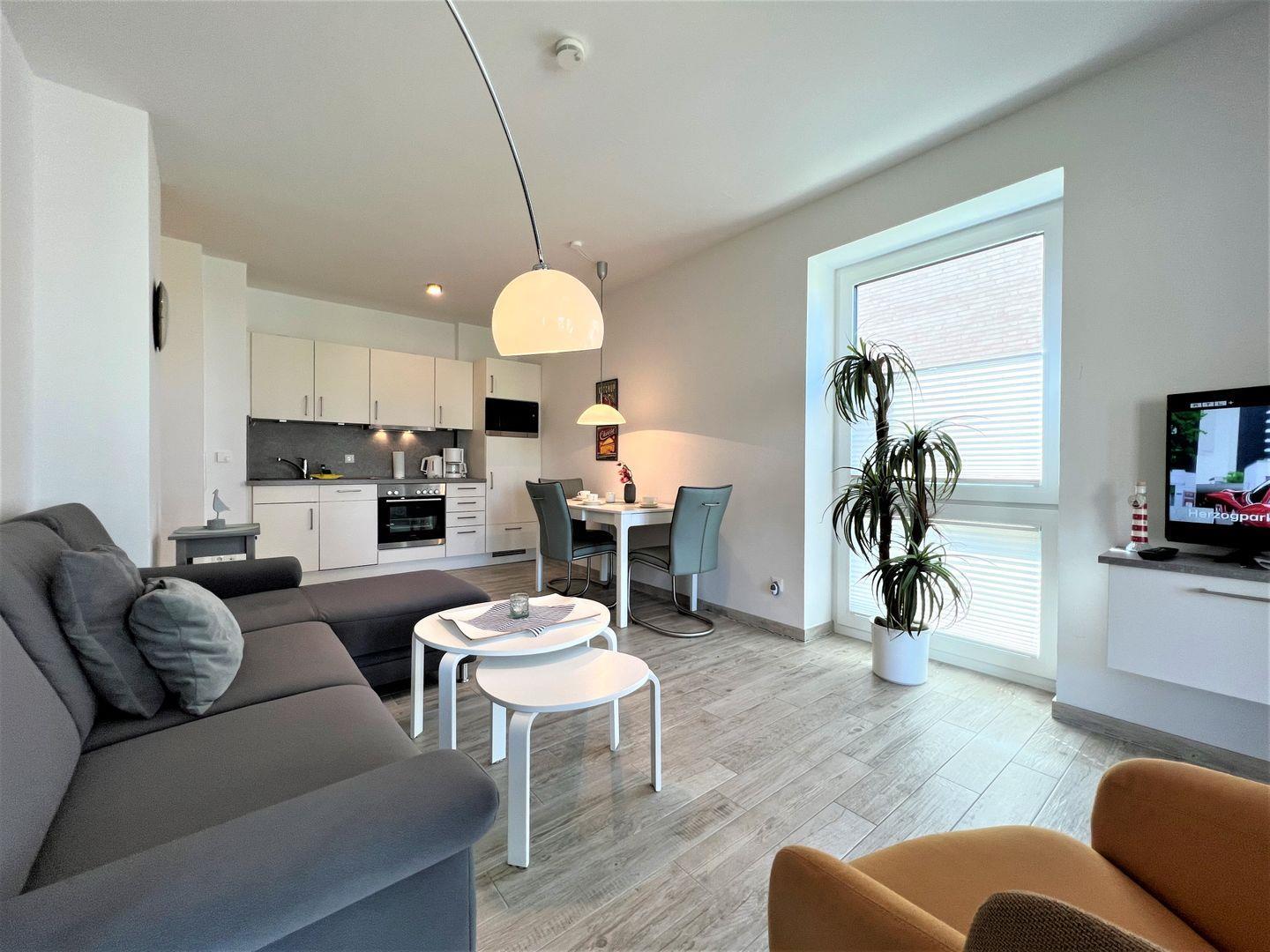 Über einen Aufzug oder die Treppe gelangen Sie zum Apartment. Vom Eingangsbereich mit praktischer Garderobe geht es in Ihr Wohlfühldomizil. Der Essbereich mit Esstisch und vollausgestatteter Küche ist mit besten Markengeräten ausgestattet. Fließend geht es über zum großzügigen Wohnbereich mit gemütlicher Eckgarnitur und großem Flat-TV auf einem schwebenden Sideboard. Von dort gelangen Sie auf den großen, überdachten Westbalkon mit modernen Gartenmöbeln. Dieser ist über eine Stufe erreichbar und daher nicht rollstuhlgerecht. Auch zwei Sonnenliegen aus edlem Massivholz laden zur Entspannung bei tollem Wetter ein.