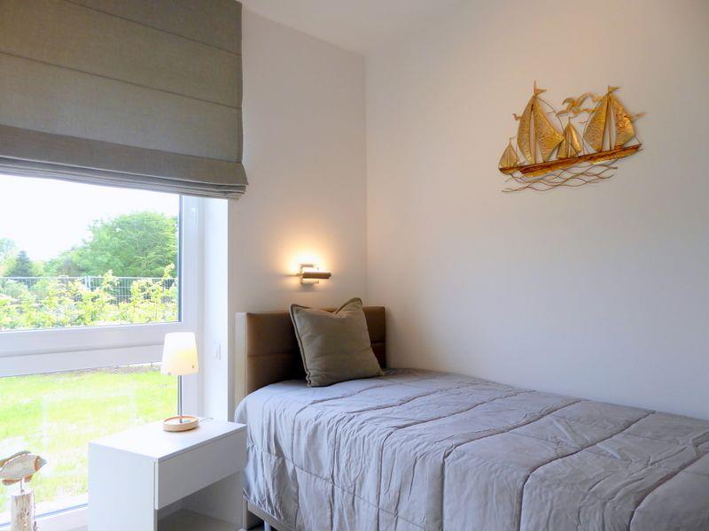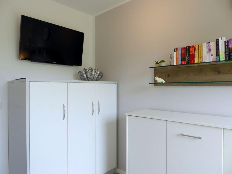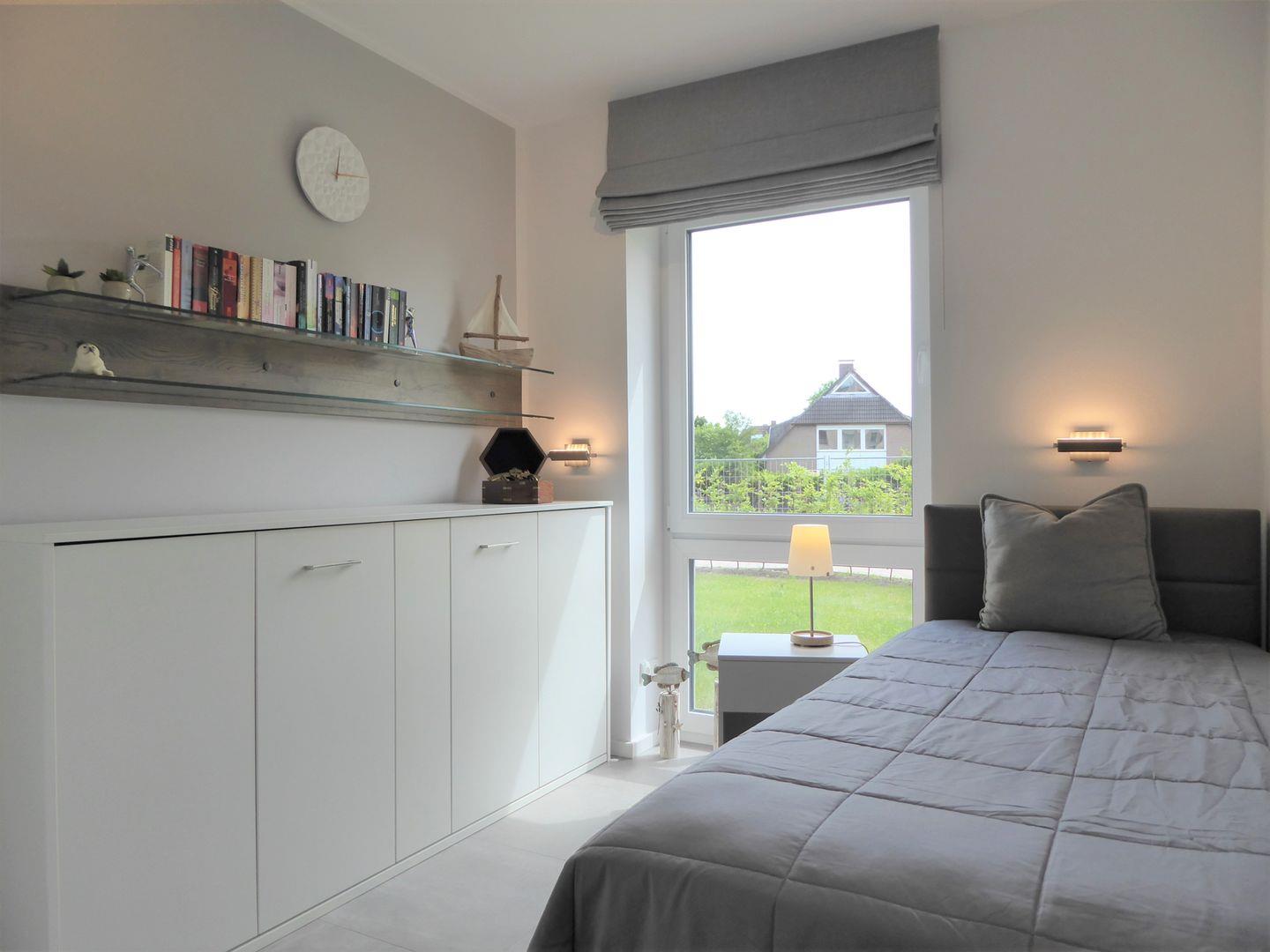 2. Schlafzimmer: Single-Boxspringbett in Komforthöhe, vollwertiges Wandklappbett, Full HD Flat-TV, Blue-Ray-/DVD Player, Highboard, kleine Bibliothek