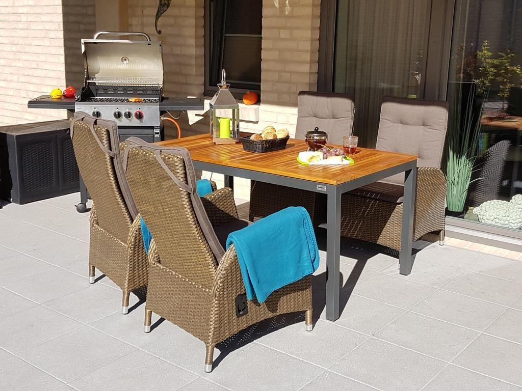 Vom Wohnbereich gelangen Sie dann auf die große und überdachte Südterrasse mit vier verstellbaren Hochlehnersesseln und einem ausziehbaren Teakholztisch. Selbstverständlich steht Ihnen dort auch ein professioneller Gasgrill mit Turbozone für ausgiebige Grillabende zur Verfügung.