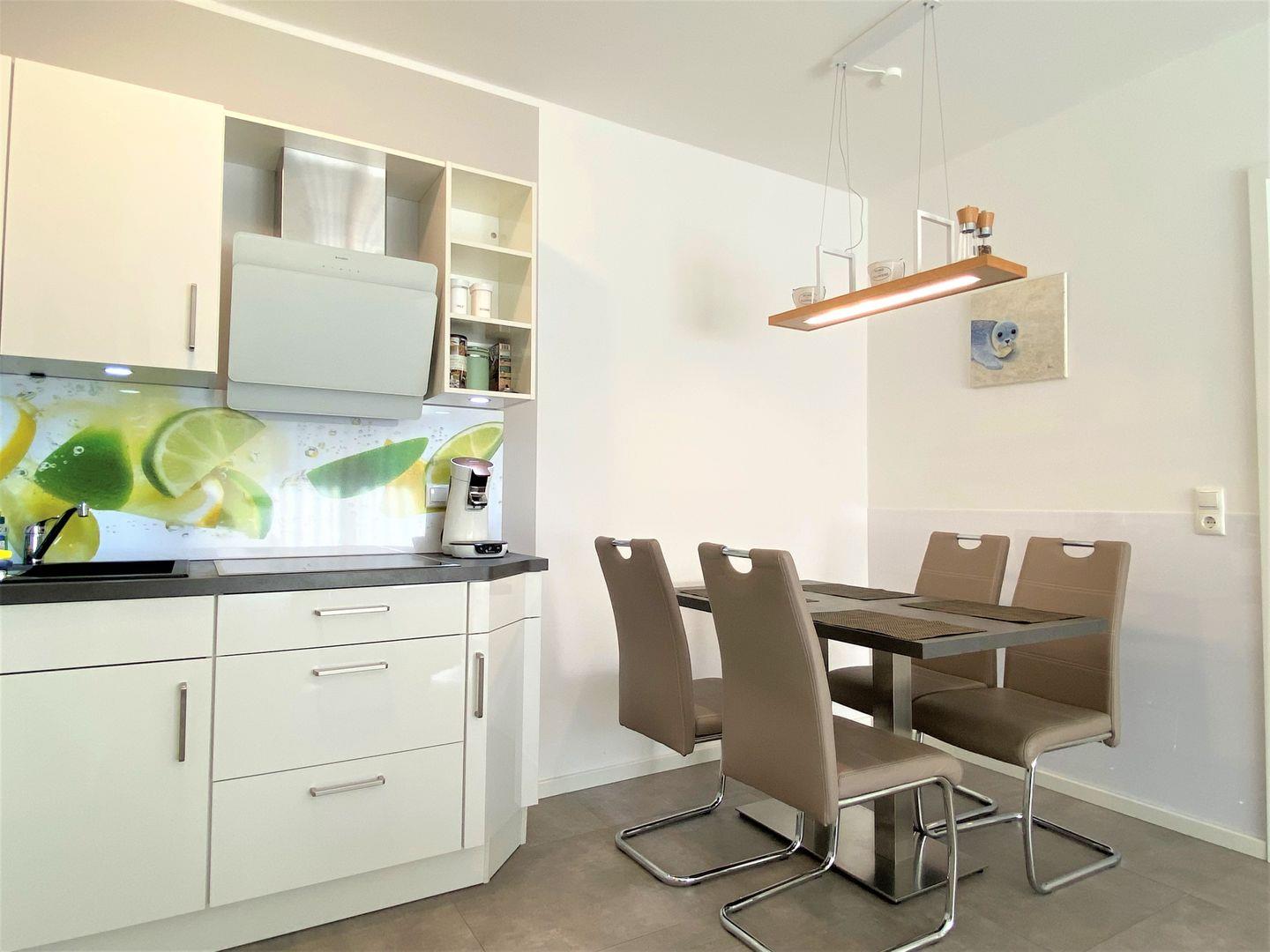 Küche: Backofen in Stehhöhe, 4-Zonen Cerankochfeld, Kühlschrank mit Gefrierfach, angeschrägte Dunstabzugshaube, Geschirrspüler, Mikrowelle, Toaster, Wasserkocher, Filterkaffeemaschine und Senseo-Pad-Maschine, Markengeschirr von Seltmann-Weiden und WMF, Esstisch mit 4 Schwingstühlen