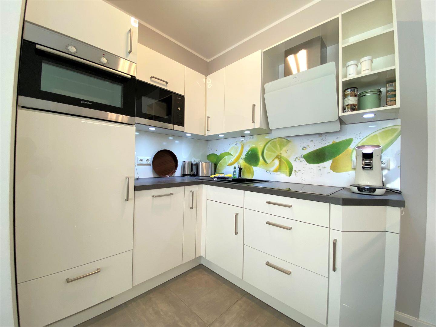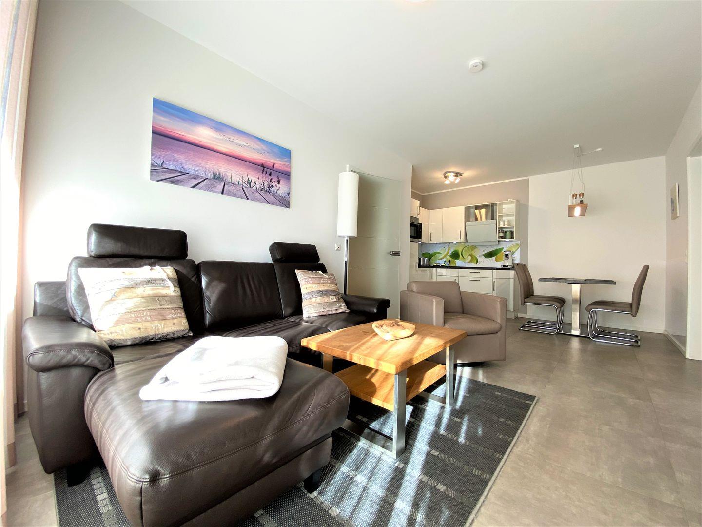 Das Herzstück des Apartments ist der stimmige Wohn-Essbereich mit voll ausgestatteter Küche im modernen Design, einem Esstisch mit edlen Schwingstühlen und einem Wohnbereich, der allerhöchste Ansprüche erfüllt. Sollte draußen mal eine frische Nordseebrise wehen, sorgt hier ein hochmoderner 3D-Elektrokamin, gepaart mit einer innovativen Wandbild-Infrarotheizung, auf Knopfdruck für wohliges Ambiente zum Träumen und Verlieben.
