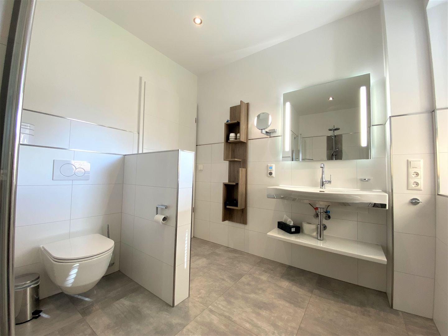 Bad: großzügiges Badezimmer mit Regendusche, integriertes WLAN-Radio, Waschtischanlage mit beleuchtetem Spiegel und hochwertigem LED-Kosmetikspiegel, Handtuchheizung