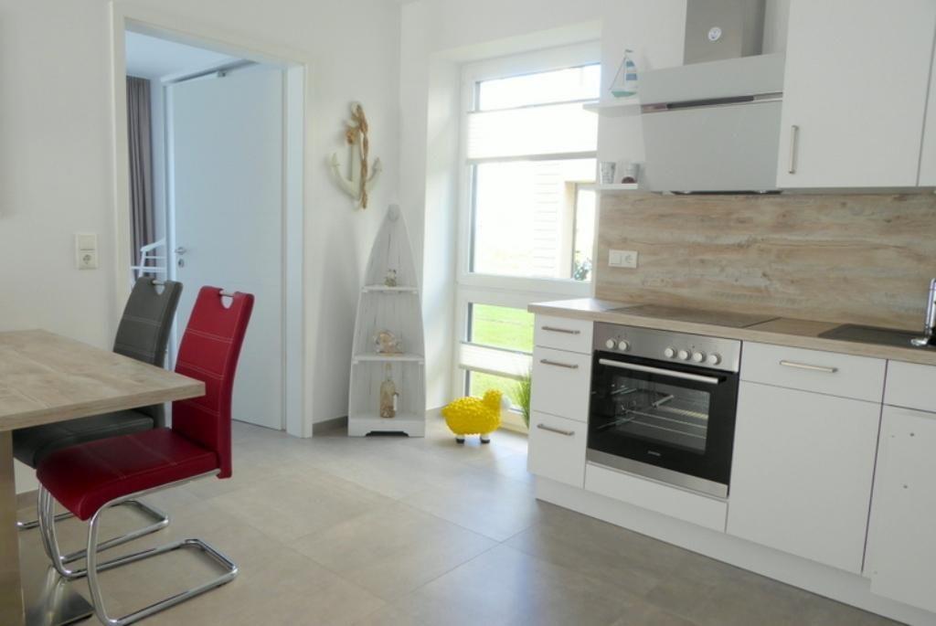 Außerdem erreichen Sie vom Flur den großzügigen Wohn-Essbereich. Die einladend weiße Küche ist voll ausgestattet und zum Wohn-Essbereich hin offen. Die gemütliche Eckcouch lädt zum Entspannen ein. Für Unterhaltung sorgen das Radio mit USB-Anschluss und der Flachbildfernseher. Der Zugang zur überdachten Westterrasse bekommt seine Pluspunkte durch den tollen großen Garten. Hier gibt es viel Platz, um das schöne Wetter der Nordsee zu genießen!