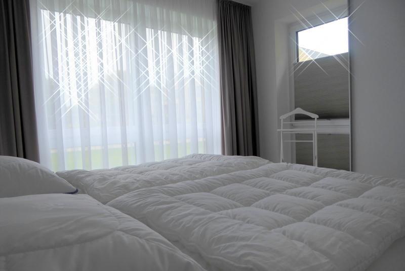 Im Hauptschlafzimmer erwarten Sie ein Doppelbett, die große Schrankwand mit viel Stauraum, ein Flat-TV und eine gemütliche Stimmung. In beiden Räumen sorgen Plissees für eine schnelle und einfache Verdunklung.
