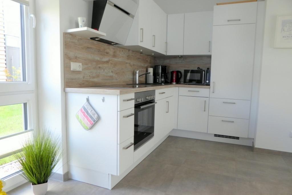 Küche und Haushalt: Einbauküche, Kühlschrank mit Gefrierfach, 4-Zonen Cerankochfeld, Backofen, Mikrowelle, Dunstabzugshaube, Geschirrspüler, Toaster, Wasserkocher, Kaffeepadmaschine, Eierkocher, hochwertiges Geschirr und Besteck