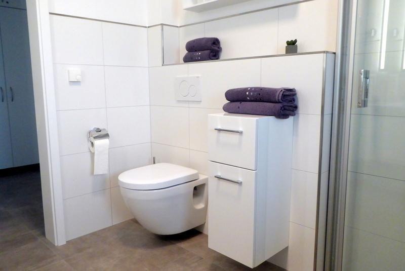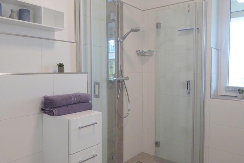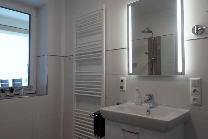 Bad und Sanitär: bodentiefe, barrierefreie Sommerregendusche, Waschtischanlage mit Spiegel, Föhn, Kosmetikspiegel, WC, Handtuchheizung, Handtücher auf Anfrage