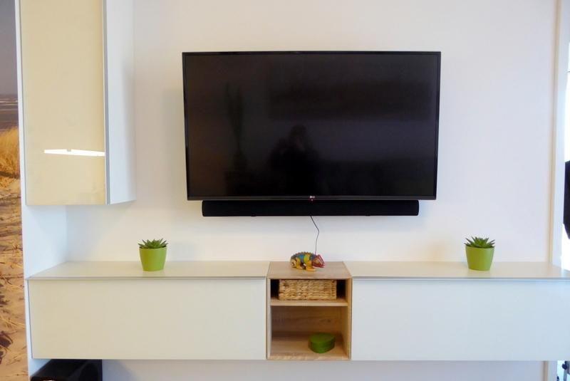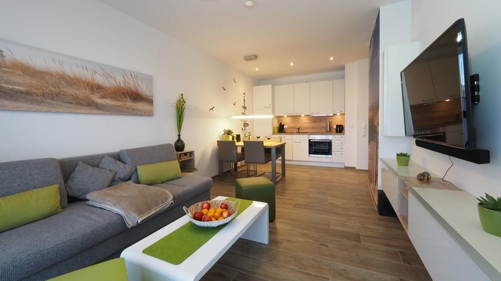Am massiven Esstisch mit Leder-Freischwingern kann man gemütlich frühstücken oder auch mit Freunden einen Spielabend verbringen. Die kleine, vollständig ausgestattete Markenküche liegt offen zum Wohn-Essbereich. Im Wohnzimmer lädt das große, gemütliche Sofa zum Lesen, Fernsehen oder Musik hören ein. Am 55"-Flachbildfernseher ist eine Magnat-Soundbar angeschlossen, über die Sie auch Radio oder Ihre Lieblingsmusik via Bluetooth vom Smartphone oder Tablet hören können. Durch eine breite Terrassentür gelangen Sie direkt auf den großzügigen und überdachten Balkon mit Süd-Westausrichtung. Dieser ist über eine Stufe erreichbar und daher nicht rollstuhlgerecht.