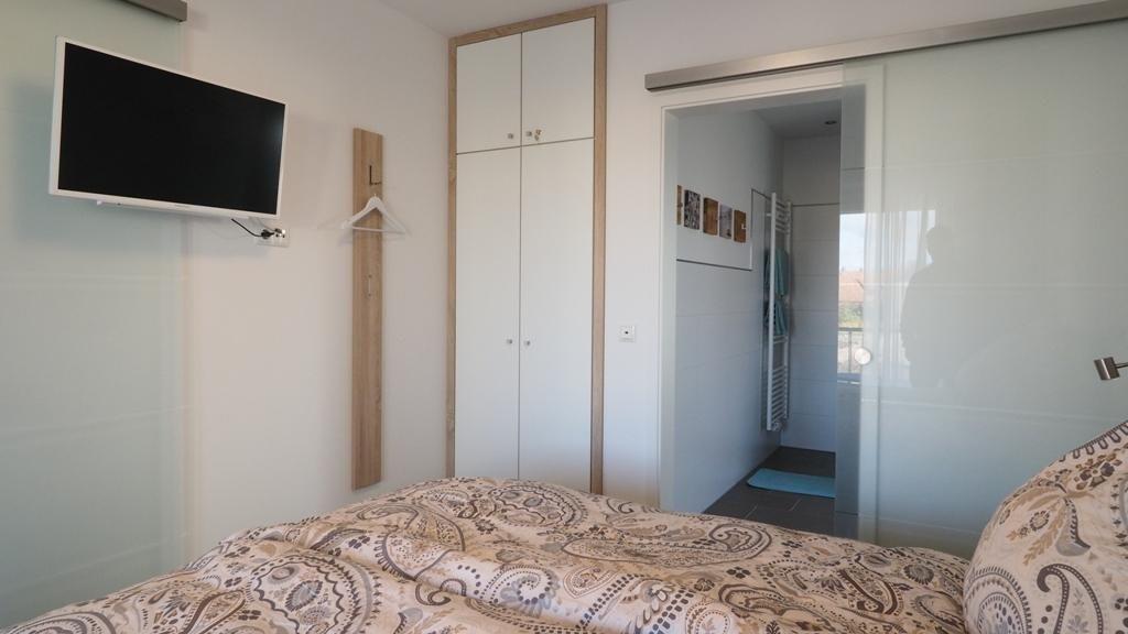 Im angrenzenden Schlafzimmer steht ein geräumiger Einbauschrank plus Wandgarderobe und ebenfalls ein Flachbildfernseher zur Verfügung. Im Hülsta-Boxspringbett, ausgestattet mit Taschenfederkernmatratzen unterschiedlichen Härtegrades (2/3) findet jeder seinen erholsamen Schlaf. Auch von hier ist der Balkon über ein großes Fensterelement direkt erreichbar.