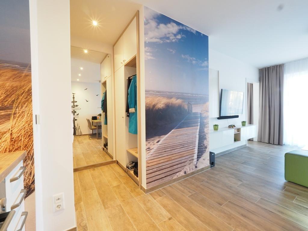 Durch einen kleinen Flur mit Garderobe und großem Spiegel geht es in dem großzügigen, Licht durchfluteten Wohn- und Essbereich. Die hochwertige und geschmackvolle Einrichtung in modernem, gradlinigem Design "ohne unnötigen Schnickschnack" bietet zwei Personen bestmöglichen Komfort.