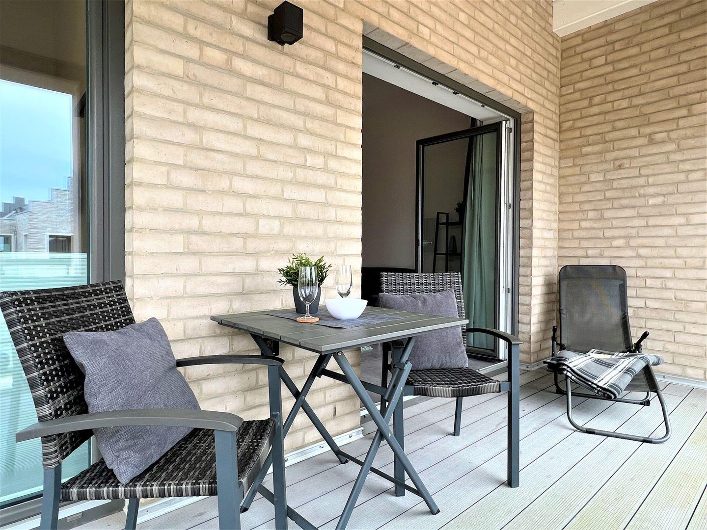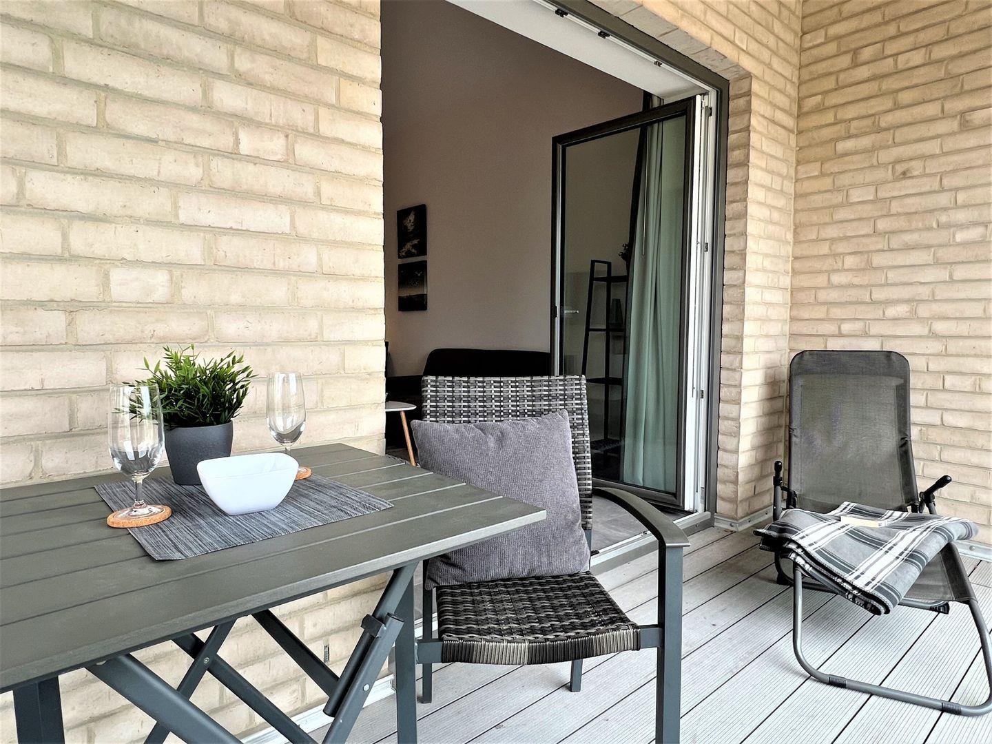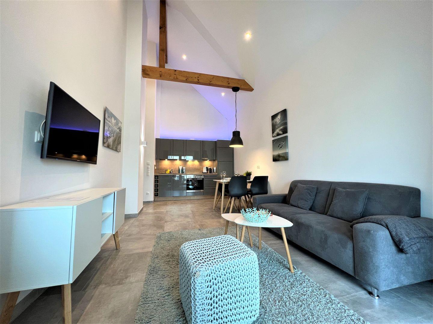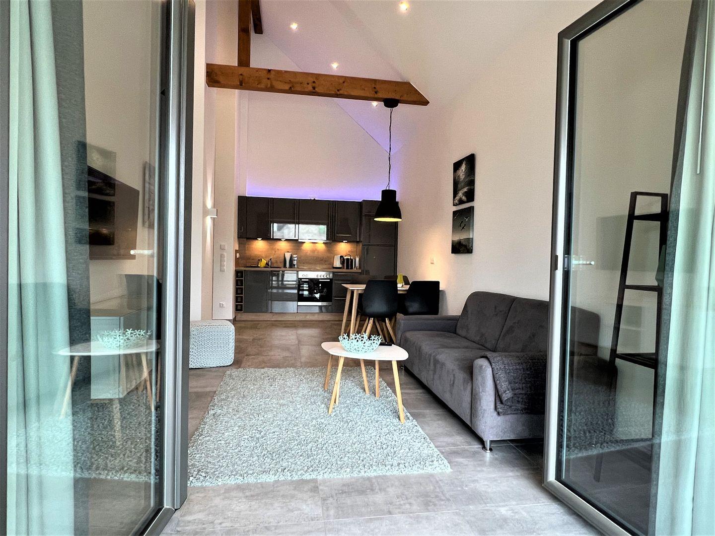 Vom Eingangsbereich mit praktischer Garderobe geht es in Ihr Wohlfühlapartment. Die hohen Decken lassen Ihnen Luft zum Urlauben. Der offene Wohn-Essbereich mit voll ausgestatteter Küche ist mit besten und neuesten Geräten ausgestattet. Mikrowelle und Backofen, Geschirrspüler und eine Nespresso-Maschine sind vorhanden. Die bequeme Sitzgarnitur lädt zum Entspannen ein. Ein großer Flat-TV sorgt für beste Unterhaltung. Von hier aus gelangen Sie auf den großen, überdachten Westbalkon mit modernen Gartenmöbeln. Dieser ist über eine Stufe erreichbar und daher nicht rollstuhlgerecht.