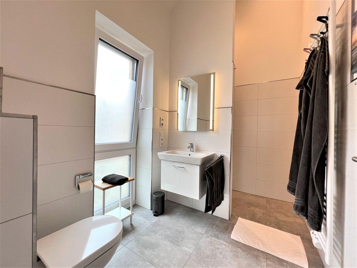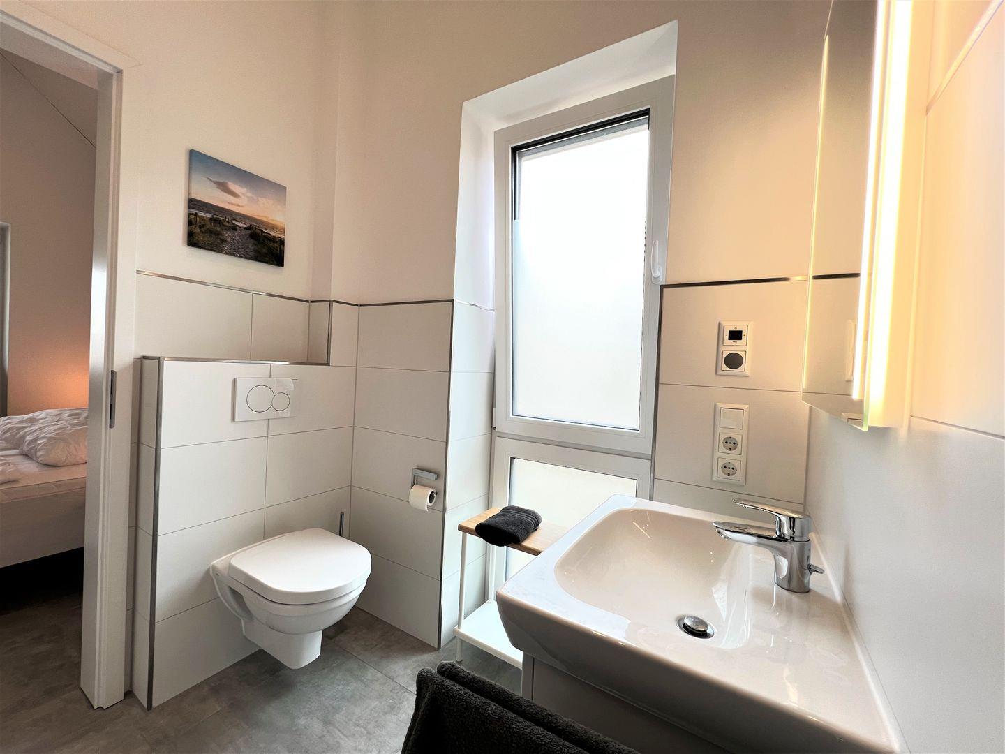 Vom Schlafzimmer geht es weiter zu Ihrem Duschbad mit WC, beleuchtetem Spiegel und begehbarer Sommerregendusche.