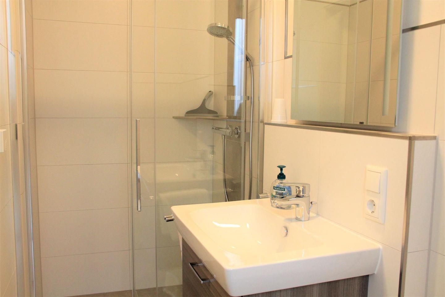 Duschbad im 1. OG: bodentiefe, barrierefreie Dusche, Waschtischanlage mit Spiegel, WC, Handtuchheizung, Föhn